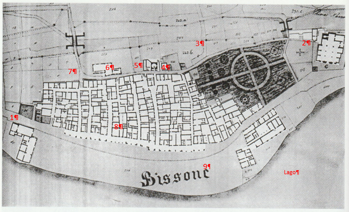 L’ancien village de Bissone s’étendait de l’oratoire de San Rocco (1) à l’église de San Carpoforo (2). En amont, il était délimité par un mur d’enceinte (3), dans lequel s’ouvraient quatre portes (4, 5, 6, 7) qui constituaient les seules voies d’accès au village. Celles-ci étaient fermées le soir à des fins défensives et pour empêcher l’entrée d’animaux sauvages. Le chemin muletier qui reliait le village aux localités de Campione et de Maroggia courait parallèlement au mur. Vers le sud-ouest, le bourg était fermé par le lac. Les premières habitations surgirent adossées au mur, à un niveau plus élevé par rapport au lac, à l’abri des inondations. Par la suite, le village s’étendit vers la rive du lac, centre de la vie laborieuse liée au trafic et à la pêche, selon un schéma en peigne qui donna origine aux actuelles contrade. Au cours des siècles, de nouvelles habitations furent construites, jusqu’à constituer l’actuel front de maisons avec les portiques caractéristiques (8), en grande partie œuvre des corporations artistiques des XVIe, XVIIe et XVIIIe siècles. Avec la construction du pont-digue de Melide (1847), la liaison avec les localités voisines fut modifiée et la route cantonale vint à se trouver entre les maisons et la rive du lac (9). La réalisation de l’axe ferroviaire Lugano-Chiasso (1874) et le tracé autoroutier (1960-70) délimitèrent de façon définitive la physionomie de Bissone, séparant l’ancien village des nouveaux établissements.